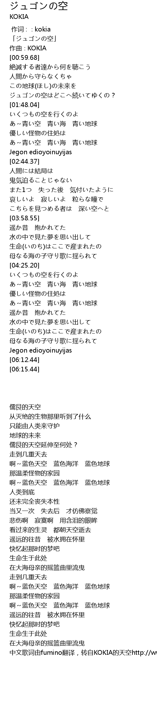 | [05:47.57] | 中文歌词由fumino翻译,转自KOKIA的天空http://www.blogbus.com/kokiasky-logs/61526009.html |