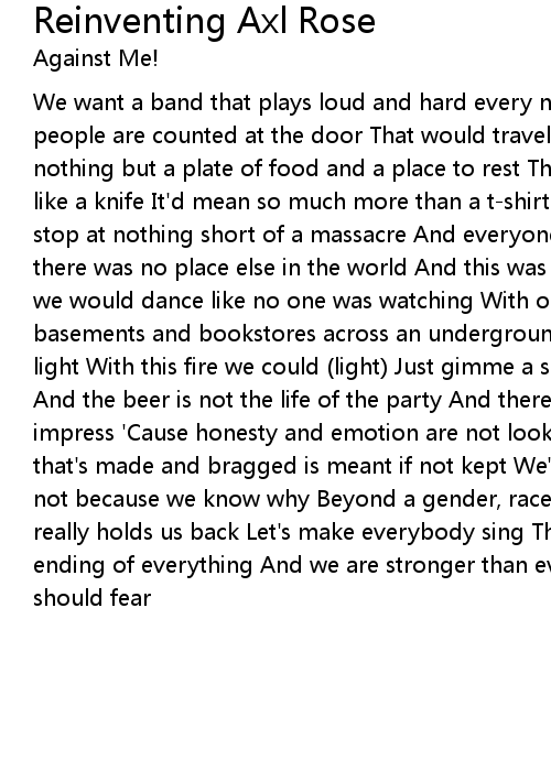 We want a band that plays loud and hard every night And doesn't care how many people are counted at the door That would travel one million miles and ask for nothing but a plate of food and a place to rest They'd strike chords that cut like a knife It'd mean so much more than a t-shirt or a ticket stub They would stop at nothing short of a massacre And everyone would leave with the memory there was no place else in the world And this was where they always belonged And we would dance like no one was watching With one fist in the air Our arenas just basements and bookstores across an underground America With this fire we could light With this fire we could (light) Just gimme a scene where the music is free And the beer is not the life of the party And there's no need to shit talk or impress 'Cause honesty and emotion are not looked down upon And every promise that's made and bragged is meant if not kept We'd do it all because we have to, not because we know why Beyond a gender, race, and class, we could find what really holds us back Let's make everybody sing That they are the beginning and ending of everything And we are stronger than everything they taught us that we should fear |