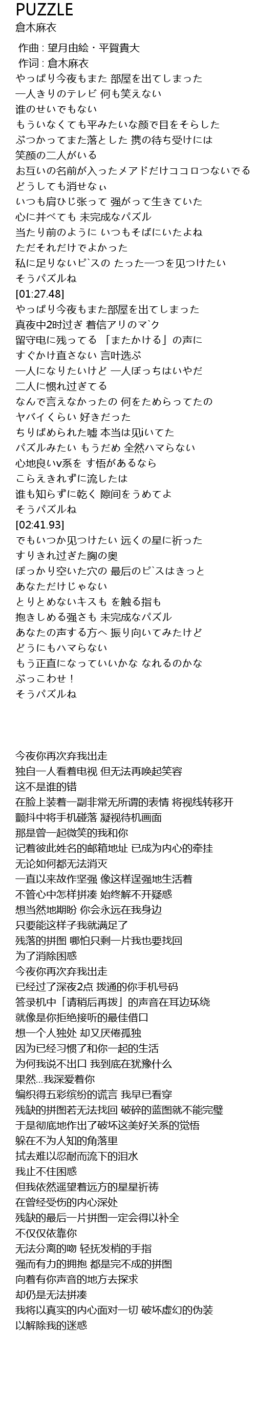 | [01:15.18] | 残落的拼图 哪怕只剩一片我也要找回 |