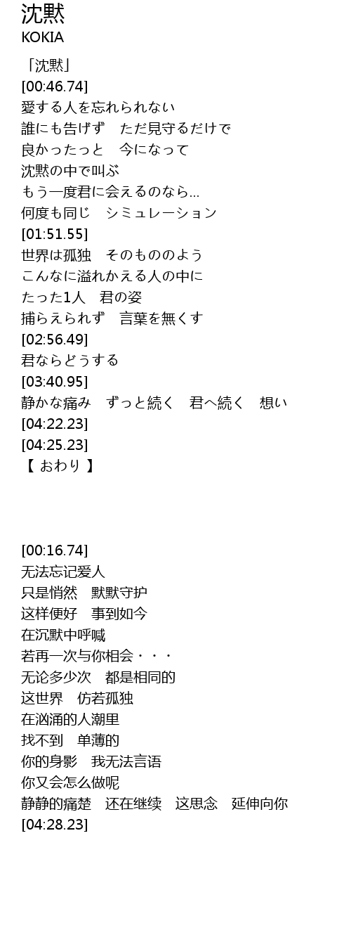| [01:20.54] | 沈黙の中で叫ぶ |