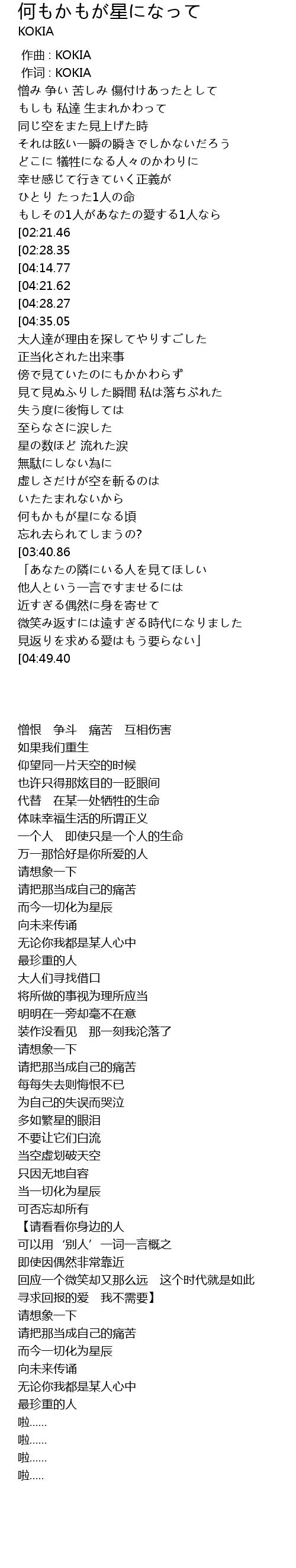 | [01:12.45][04:14.77] | 何もかもが星になっては |