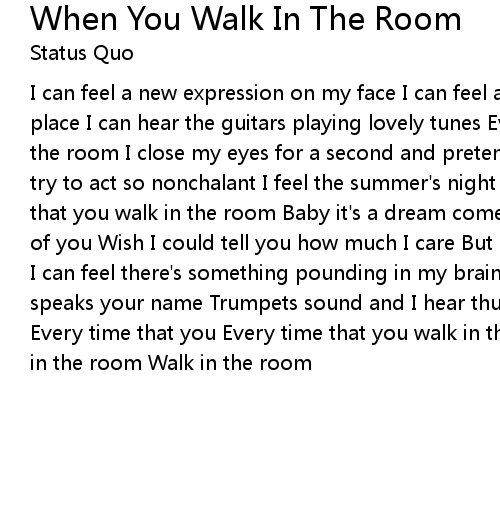 I can feel a new expression on my face I can feel a glowing sensation taking place I can hear the guitars playing lovely tunes Every time that you walk in the room I close my eyes for a second and pretend it's me you want Meanwhile I try to act so nonchalant I feel the summer's night with a magic moon Every time that you walk in the room Baby it's a dream come true Standing right alongside of you Wish I could tell you how much I care But I only have the nerve to stare I can feel there's something pounding in my brain Just anytime that someone speaks your name Trumpets sound and I hear thunder boom Every time that you Every time that you Every time that you walk in the room Walk in the room Walk in the room Walk in the room |