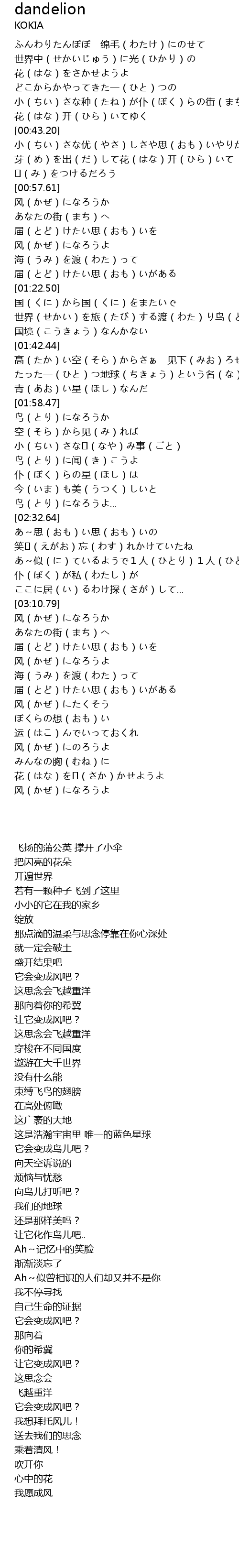 | [00:23.70] | ふんわりたんぽぽ 绵毛(わたけ)にのせて |