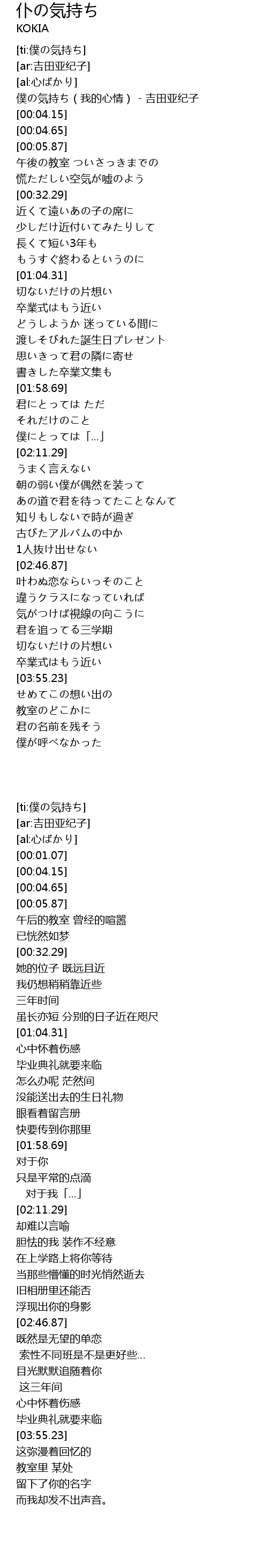 | [00:01.07] | 僕の気持ち(我的心情) - 吉田亚纪子 |