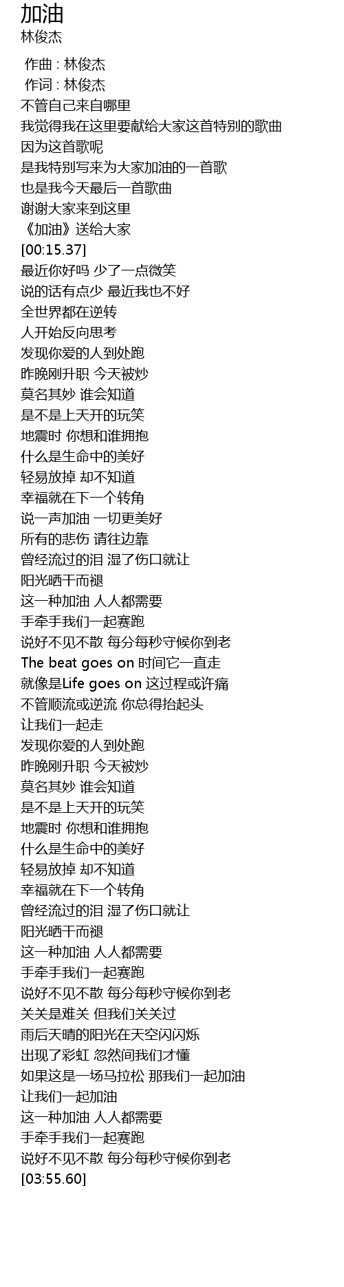 | [00:06.51] | 是我特别写来为大家加油的一首歌 |