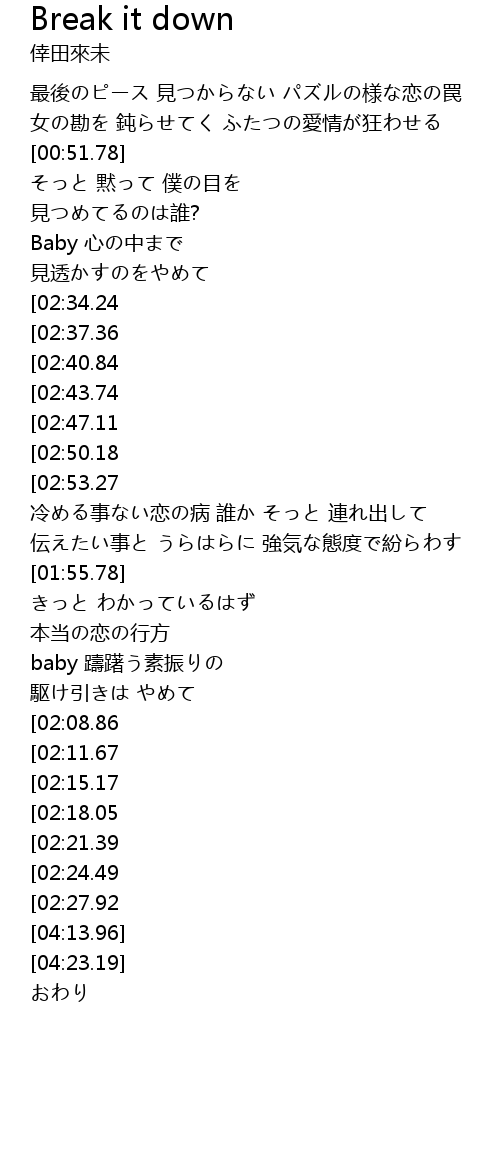 | [03:31.75][02:40.84][01:10.95] | I just wanna breaking it down |