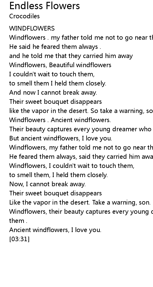 [03:00] Windflowers, their beauty captures every young dreamer who lingers near them .