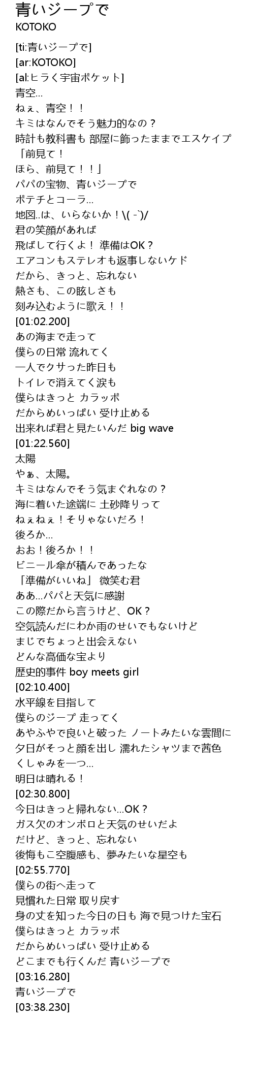 | [03:11.120] | どこまでも行くんだ 青いジープで |