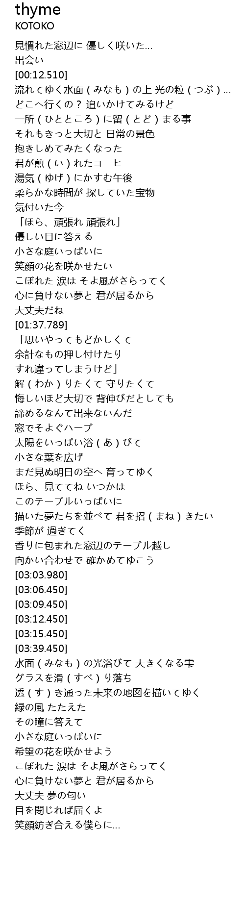 | [00:56.880] | 柔らかな時間が 探していた宝物 |