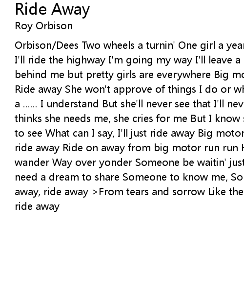 Orbison/Dees Two wheels a turnin' One girl a yearnin' Big motor burnin' the road I'll ride the highway I'm going my way I'll leave a story untold Pretty girls behind me but pretty girls are everywhere Big motor wind up, ride away from here Ride away She won't approve of things I do or what I am And I don't really give a ...... I understand But she'll never see that I'll never be Any one but me She thinks she needs me, she cries for me But I know she's lying, crying for others to see What can I say, I'll just ride away Big motor run run (background) ride ride away Ride on away from big motor run run Heart-ache and misery I'm bound to wander Way over yonder Someone be waitin' just for me True love to cling to, I need a dream to share Someone to know me, Someone to show me they care Ride away, ride away >From tears and sorrow Like there's no tomorrow Tonight I'll ride away |