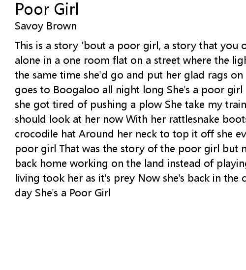 This is a story 'bout a poor girl, a story that you ought to know She lived all alone in a one room flat on a street where the lights are low Every night about the same time she'd go and put her glad rags on Go to the place where everyone goes to Boogaloo all night long She's a poor girl Born and raised in the country she got tired of pushing a plow She take my train to the city and mother you should look at her now With her rattlesnake boots, elephant bag, genuine crocodile hat Around her neck to top it off she even wears a persian cat She's a poor girl That was the story of the poor girl but now she uses her head She's back home working on the land instead of playing in bed The fast life she was living took her as it's prey Now she's back in the country getting fatter every day She's a Poor Girl |