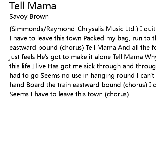 (Simmonds/Raymond-Chrysalis Music Ltd.) I quit my job, ain't got no money Seems I have to leave this town Packed my bag, run to the station Board the train eastward bound (chorus) Tell Mama And all the folks back home Sometimes a man just feels He's got to make it alone Tell Mama Why I'm leaving so soon Because this life I live Has got me sick through and through Nothing to do, that's why I had to go Seems no use in hanging round I can't stop now, the ticket's in my hand Board the train eastward bound (chorus) I quit my job, ain't got no money Seems I have to leave this town (chorus) |