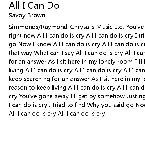 Simmonds/Raymond-Chrysalis Music Ltd. You've gone away I'll get by somehow Just right now All I can do is cry All I can do is cry I tried to find Why you said go Now I know All I can do is cry All I can do is cry Tell me why You walked out that way What can I say All I can do is cry All I can do is cry I keep searching for an answer As I sit here in my lonely room Till I find a reason to keep living All I can do is cry All I can do is cry All I can do is cry....Yeah I keep searching for an answer As I sit here in my lonely room Till I find an reason to keep living All I can do is cry All I can do is cry All I can do is cry You've gone away I'll get by somehow Just right now All I can do is cry All I can do is cry I tried to find Why you said go Now I know All I can do is cry All I can do is cry All I can do is cry |
