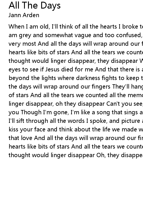 When I am old, I'll think of all the hearts I broke to be here, with you When I am grey and somewhat vague and too confused, I know I'll still remember you the very most And all the days will wrap around our fingers They'll hang around our hearts like bits of stars And all the tears we counted all the memories that we thought would linger disappear, they disappear When I lay down, and close my eyes to see if Jesus died for me And that there is a God I'll wait for you beyond the lights where darkness fights to keep the sun from coming up And all the days will wrap around our fingers They'll hang around our hearts like bits of stars And all the tears we counted all the memories that we thought would linger disappear, oh they disappear Can't you see, that all of me, is inside of you Though I'm gone, I'm like a song that sings and sighs and coos When I'm old, I'll sift through all the words I spoke, and picture all our happy times I'll kiss your face and think about the life we made with all our might, with all that love And all the days will wrap around our fingers They'll hang around our hearts like bits of stars And all the tears we counted all the memories that we thought would linger disappear Oh, they disappear |