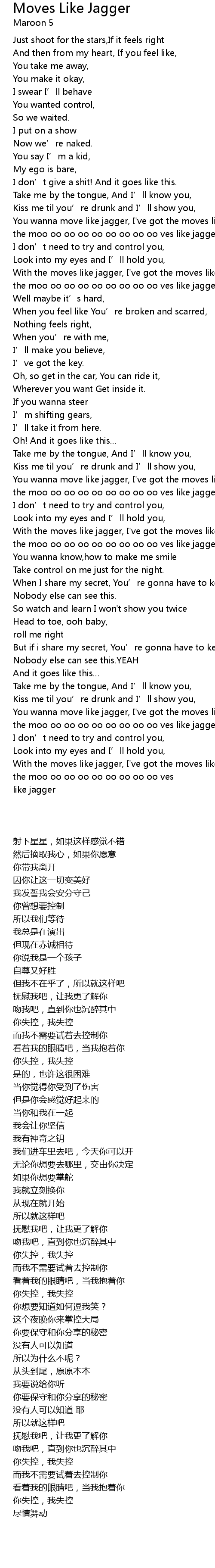| [00:52.00] | You wanna move like jagger, I' ve got the moves like jagger, I' ve got the moo oo oo oo oo oo oo oo oo ves like jagger |