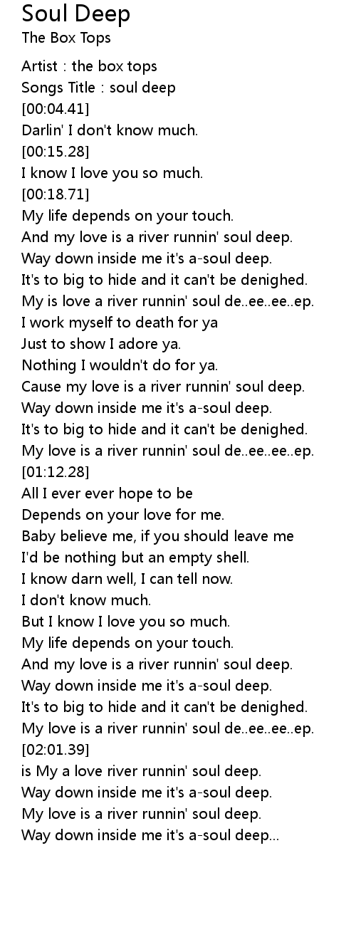 | [00:22.73] | And my love is a river runnin' soul deep. |
