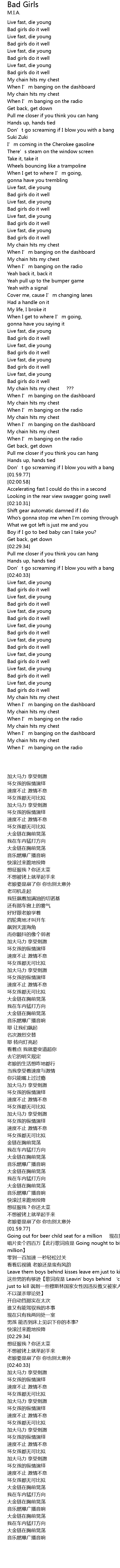 | [02:10.31] | Leave them boys behind kisses leave em just to kill 秒杀你们 这些男的有够逊【歌词应是 Leavin' boys behind ‘cause it’s legal just to kill 讽刺一些穆斯林国家女性因违反教义被家人处死 不以谋杀罪论处】 |