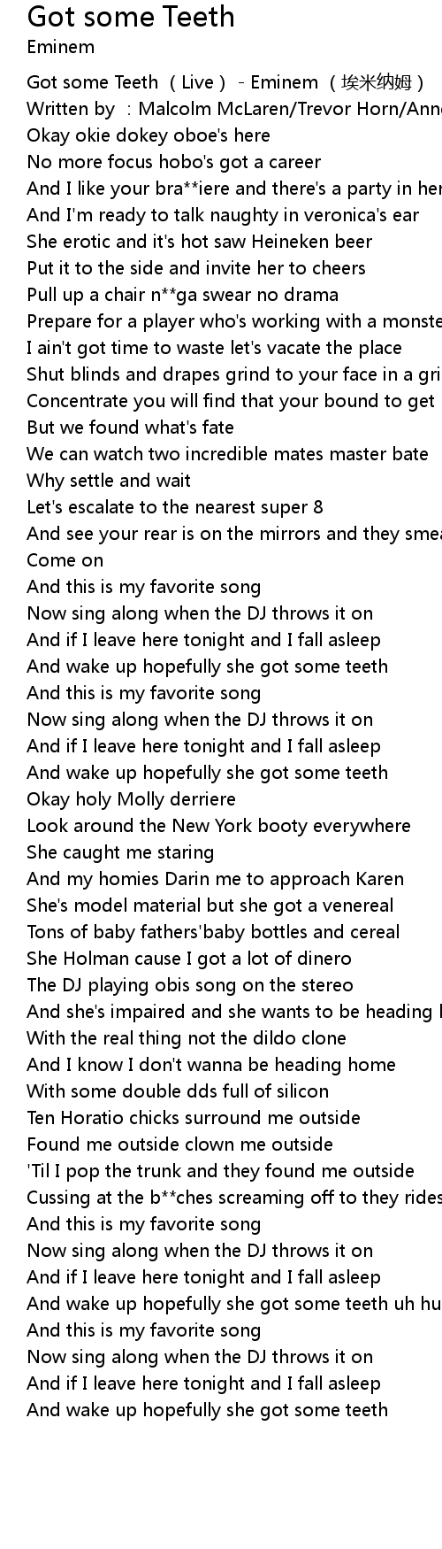 | [00:00.434] | Got some Teeth Live Eminem āi mǐ nà mǔ |