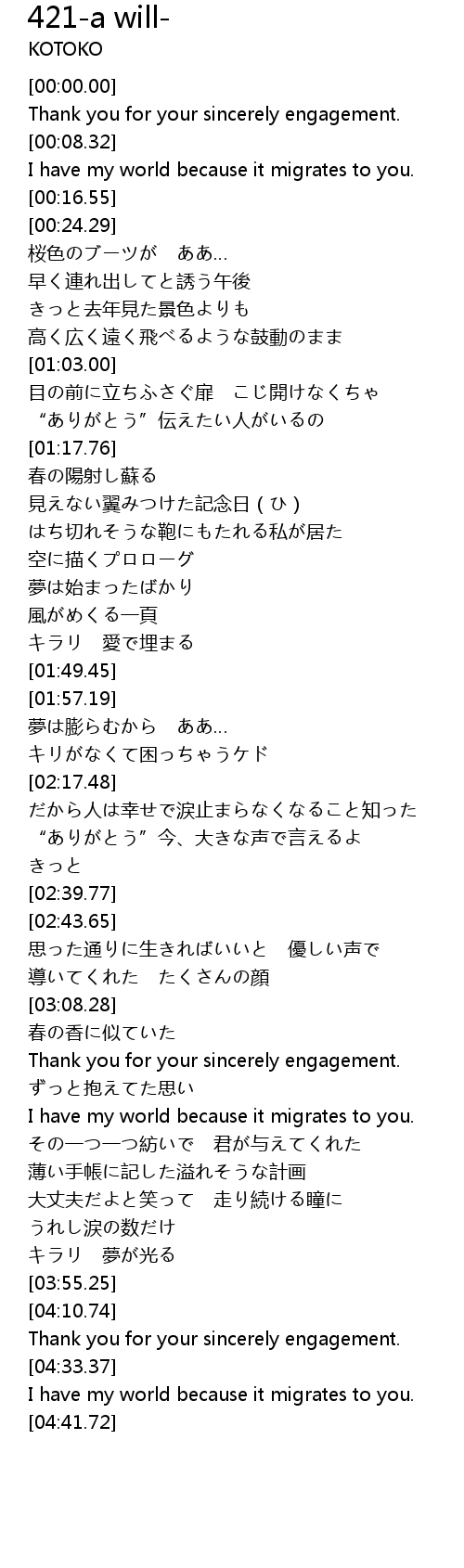 | [00:03.28] | Thank you for your sincerely engagement. |