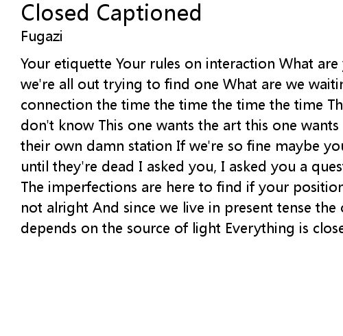 Your etiquette Your rules on interaction What are you waiting for? Nobody's home we're all out trying to find one What are we waiting for? The recipe a clear connection the time the time the time the time The direction we just want we don't know This one wants the art this one wants the politic Everybody wants their own damn station If we're so fine maybe you can tell me why no one counts until they're dead I asked you, I asked you a question, I just want I don't know The imperfections are here to find if your position is so unkind Everything is not alright And since we live in present tense the only hope of making sense All depends on the source of light Everything is closed captioned so come on |