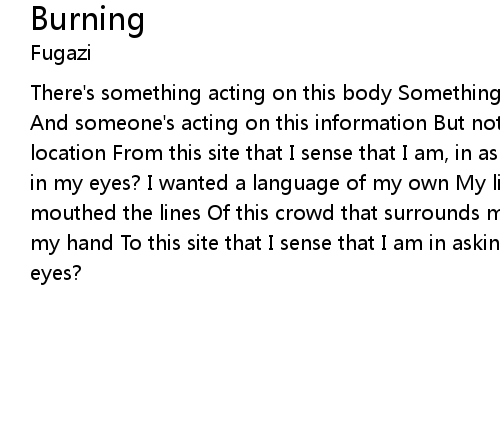 | There's something acting on this body Something goes in when nothing comes out And someone's acting on this information But nothing's registered from this location From this site that I sense that I am, in asking What is this burning in my eyes? I wanted a language of my own My lips were sucked empty and I mouthed the lines Of this crowd that surrounds me Punctured and parceled i fold my hand To this site that I sense that I am in asking What is this burning in my eyes? |