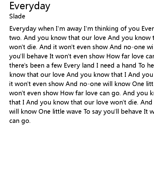 Everyday when I'm away I'm thinking of you Everyone can carry on Except for we two. And you know that our love And you know that I And you know that our love won't die. And it won't even show And no-one will know One little wave To say you'll behave It won't even show How far love can go. Everyday when I'm away And there's been a few Every land I need a hand To help me come through. And you know that our love And you know that I And you know that our love won't die. And it won't even show And no-one will know One little wave To say you'll behave It won't even show How far love can go. And you know that our love And you know that I And you know that our love won't die. And it won't even show And no-one will know One little wave To say you'll behave It won't even show How far love can go. |