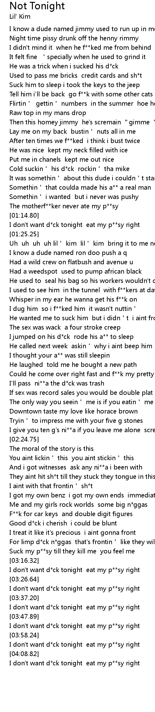 | [01:18.50] | I don't want d*ck tonight eat my p**sy right |