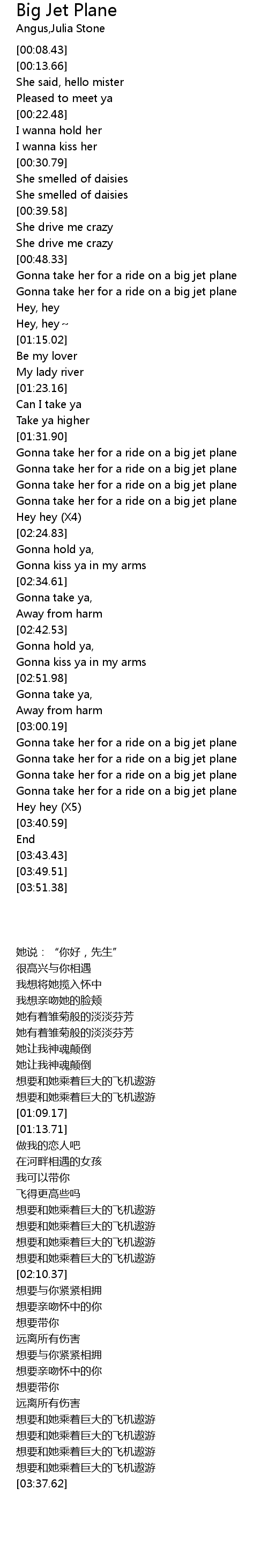 | [02:02.94] | Gonna take her for a ride on a big jet plane |