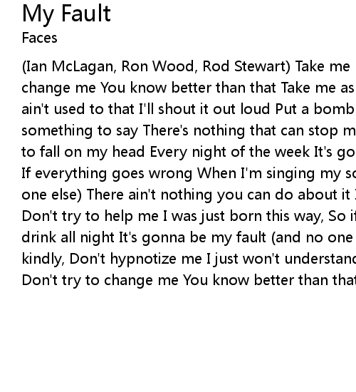 (Ian McLagan, Ron Wood, Rod Stewart) Take me like you find me Don't try to change me You know better than that Take me as you see me Don't try to hide me I ain't used to that I'll shout it out loud Put a bomb in a crowd If I got something to say There's nothing that can stop me I can't let it lay If I have to fall on my head Every night of the week It's gonna be my fault, (No one else) If everything goes wrong When I'm singing my song It's gonna be my fault (and no one else) There ain't nothing you can do about it I've sat and thought it over, Don't try to help me I was just born this way, So if everything goes wrong And I drink all night It's gonna be my fault (and no one else) So don't break it kindly, Don't hypnotize me I just won't understand Take me like you find me Don't try to change me You know better than that |