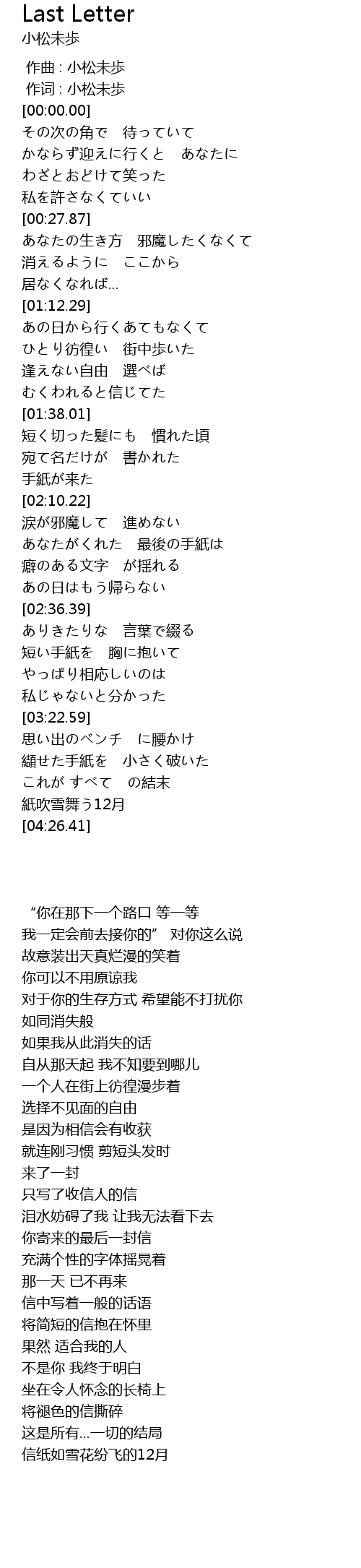 | [03:05.76] | 短い手紙を 胸に抱いて |
