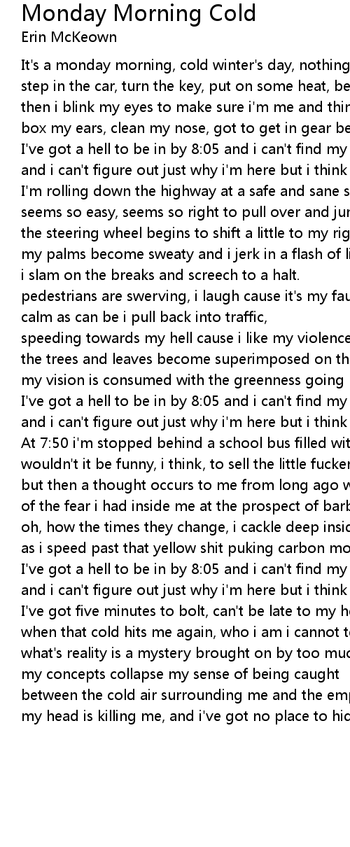 It's a monday morning, cold winter's day, nothing outside is real. |