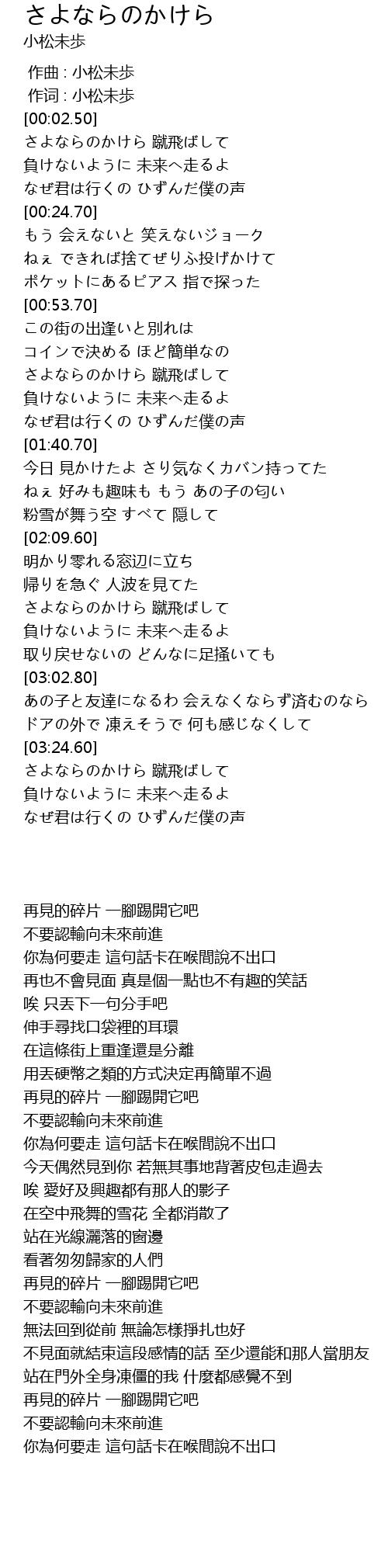 | [00:02.55] | さよならのかけら 蹴飛ばして |