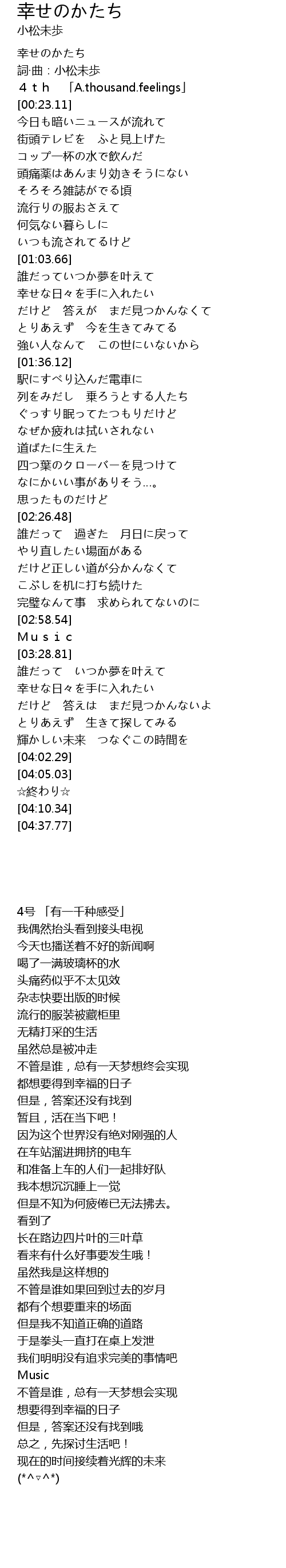 | [00:07.36] | 4th 「A.thousand.feelings」 |