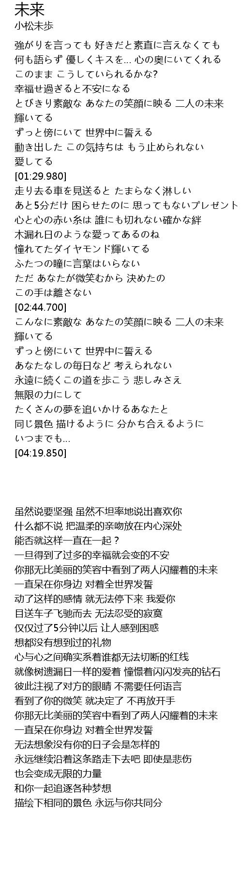| [03:21.980] | 你那无比美丽的笑容中看到了两人闪耀着的未来 |