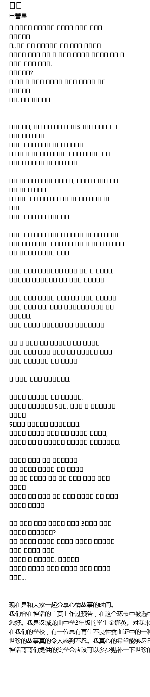 | 您好。我是汉城龙曲中学3年级的学生金娜英。对我来说,有一位特别的朋友。我之所以写这篇文章是希望能帮的上她的忙。下面就来听听关于她的故事吧。 | |