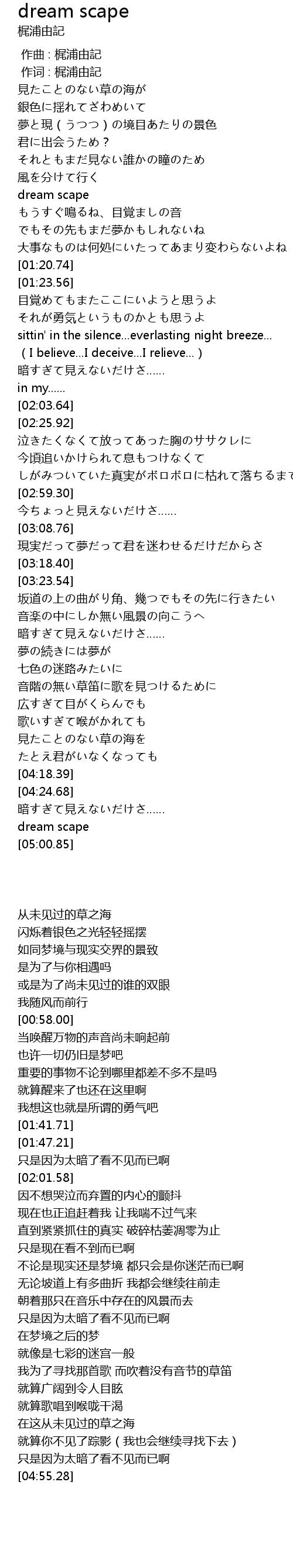 | [00:32.29] | 夢と現(うつつ)の境目あたりの景色 |