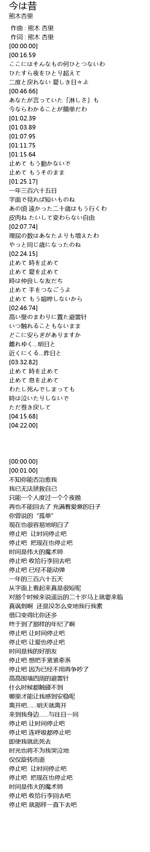 | [03:57.96][01:07.95] | 止めて 今を止めて |