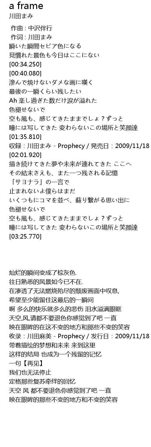 | [01:37.810] | 收录:川田麻美 - Prophecy/发行日:2009/11/18 |