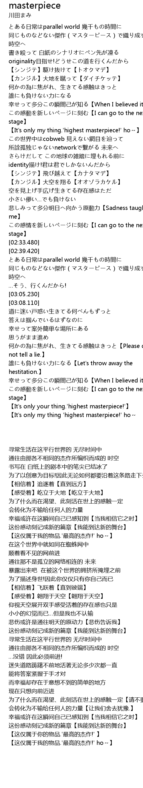 | [02:52.960] | 同じものなどない傑作(マスターピース)で織り成す 時空へ |
