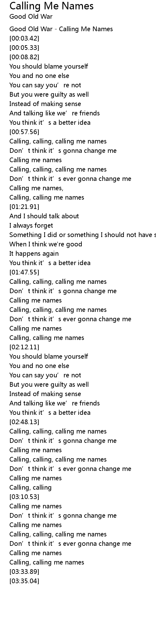 | [00:58.52] | Calling, calling, calling me names |