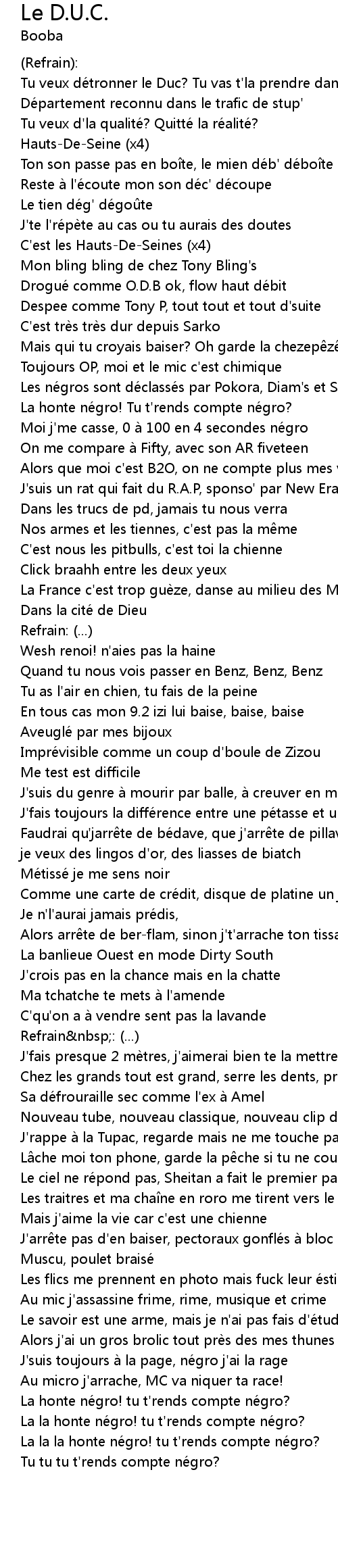| Tu veux de tronner le Duc? Tu vas t' la prendre dans l' uc | |