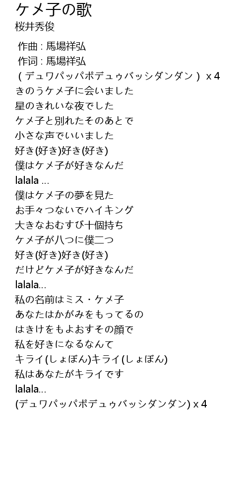 | [00:39.86] | 僕はケメ子が好きなんだ |