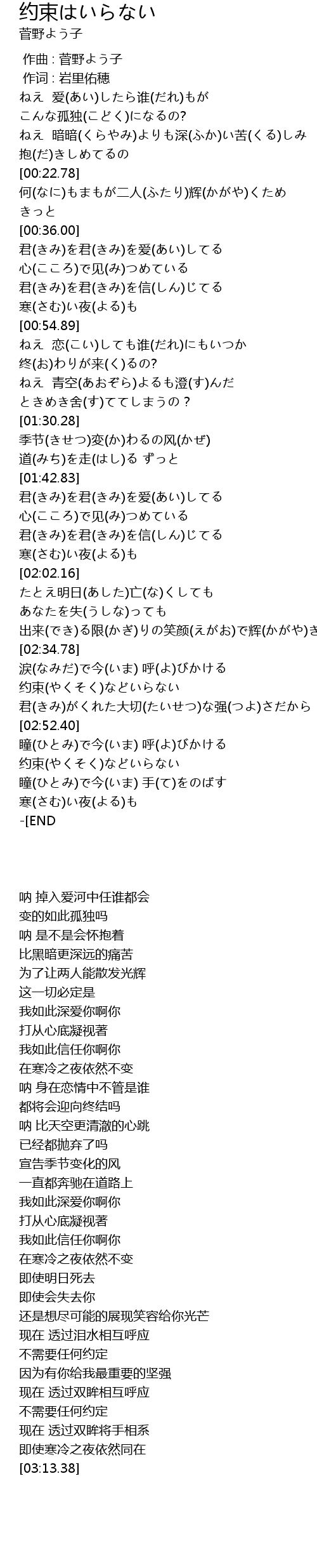 | [00:22.98] | 何(なに)もまもが二人(ふたり)辉(かがや)くため |