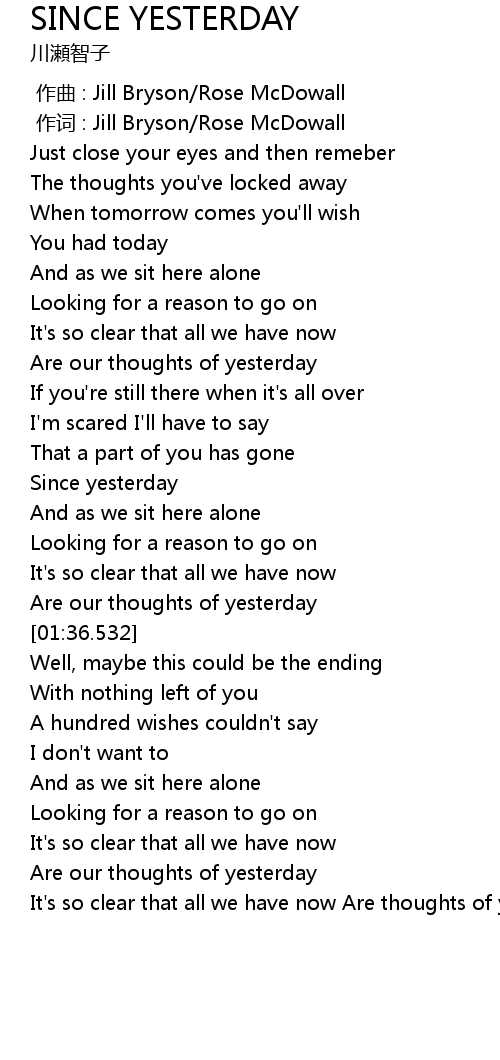 | [02:37.771] | It's so clear that all we have now Are thoughts of yesterday |