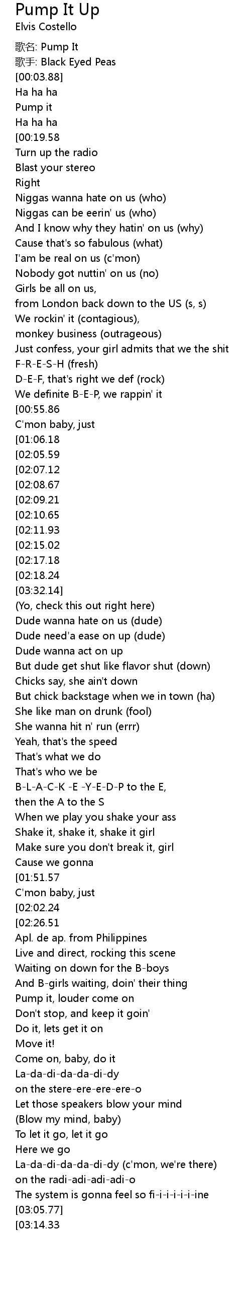 | [03:15.93][03:14.33][03:12.39][03:10.86][03:09.57][03:08.20] | Pump it (louder) |