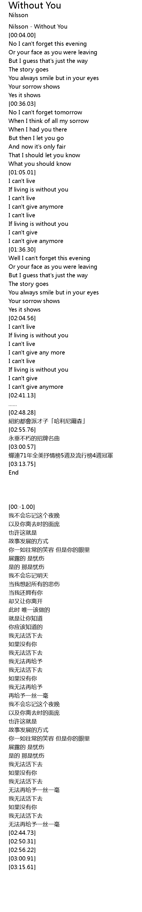 | [00:-1.00] | Nilsson - Without You |