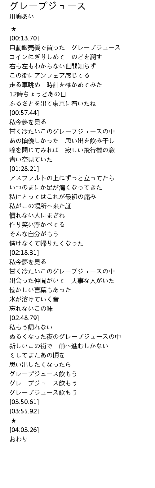 | [03:39.91] | グレープジュース飲もう |