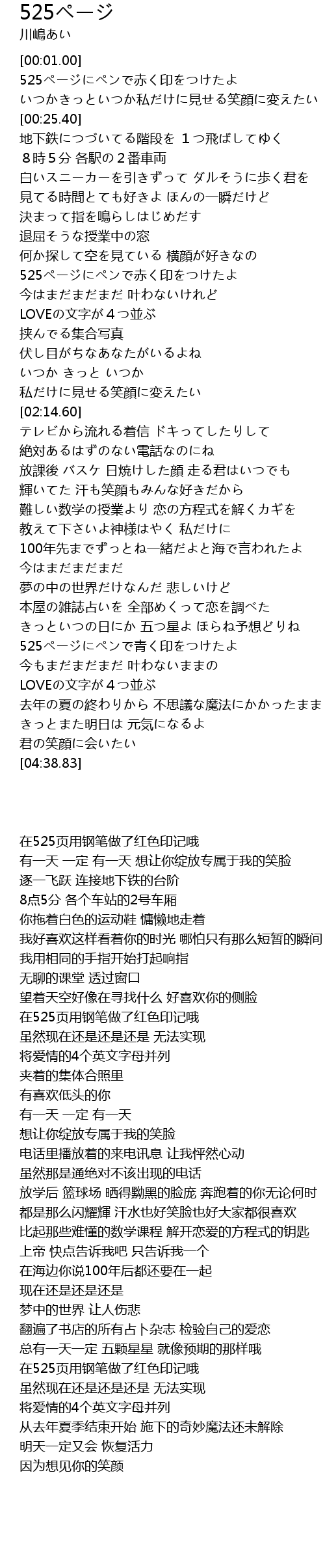 | [03:58.06] | 525ページにペンで青く印をつけたよ |