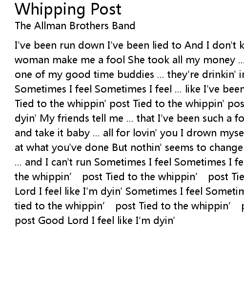 | I' ve been run down I' ve been lied to And I don' t know why ... I let that mean woman make me a fool She took all my money ... wrecked my new car Now she' s with one of my good time buddies ... they' re drinkin' in some cross town bar Sometimes I feel Sometimes I feel ... like I' ve been tied to the whippin' post Tied to the whippin' post Tied to the whippin' post Good Lord I feel like I' m dyin' My friends tell me ... that I' ve been such a fool And I have to stand by and take it baby ... all for lovin' you I drown myself in sorrow ... as I look at what you' ve done But nothin' seems to change ... the bad times stay the same ... and I can' t run Sometimes I feel Sometimes I feel ... like I' ve been tied to the whippin' post Tied to the whippin' post Tied to the whippin' post Good Lord I feel like I' m dyin' Sometimes I feel Sometimes I feel ... like I' ve been tied to the whippin' post Tied to the whippin' post Tied to the whippin' post Good Lord I feel like I' m dyin' |