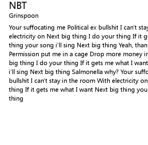 Your suffocating me Political ex bullshit I can't stay in the room With electricity on Next big thing I do your thing If it gets me what I want Next big thing your song i'll sing Next big thing Yeah, thank god for sanctuary Permission put me in a cage Drop more money in I'm dancing like a puppet Next big thing I do your thing If it gets me what I want Next big thing your song i'll sing Next big thing Salmonella why? Your suffocating me Political ex bullshit I can't stay in the room With electricity on Next big thing I do your thing If it gets me what I want Next big thing your song i'll sing Next big thing |